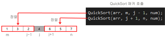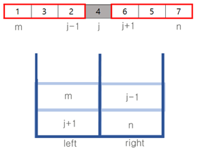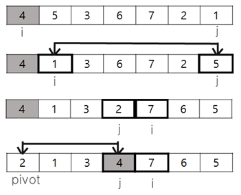 두 수의 위치를 바꾼다. (그림에서는 이미 위치를 바꾼 뒤의 상태) - 이를 반복하다 [작은 수(j)의 위치 <큰 수(i)의 위치]가 되는 경우