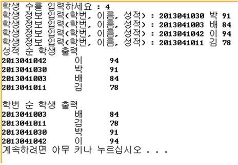 Ex) 학생 정보를 입력받아 성적 순, 학번 순 정렬