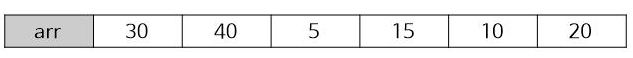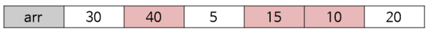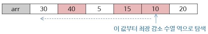 위와 같이 30, 40, 5, 15, 10, 20인 수열이 존재한다면 이 수열에 대해서 최장 감소 수열은
