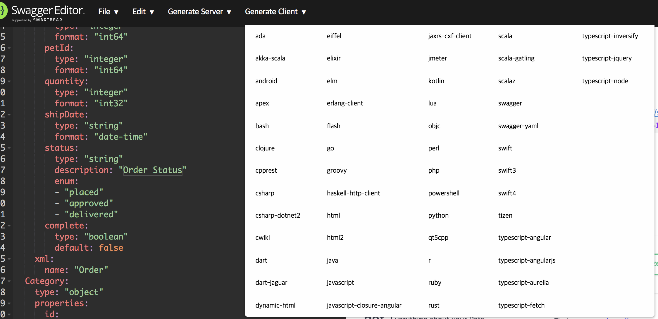 위 명령어로 현재 폴더에 있는 swaggerPetstore.yml(swagger editor에서 예시로 주는 yml을 따로 파일로 저장한 것) 이라는 이름을 가진 openAPI yml 파일을 openApi-Generator 폴더에 typescript-axios 형식으로 generate한 결과를 저장한다.