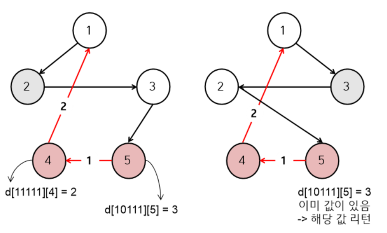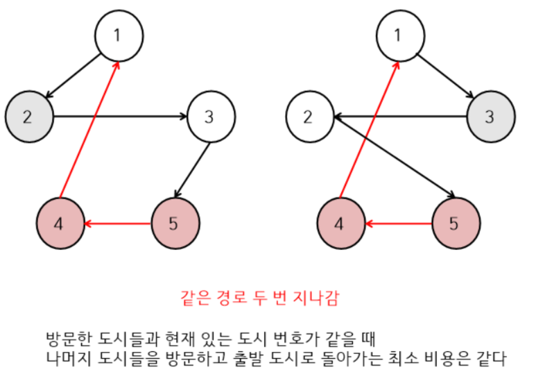 이미 방문한 도시들과 현재 위치한 도시가 같은 경우에는 최소 비용이 일정하므로, 4,5번 도시를 방문하지 않고 5번 도시에서의 최소 비용은 같습니다. 따라서 이를 두 번 구하는 것은 효율적이지 않습니다.