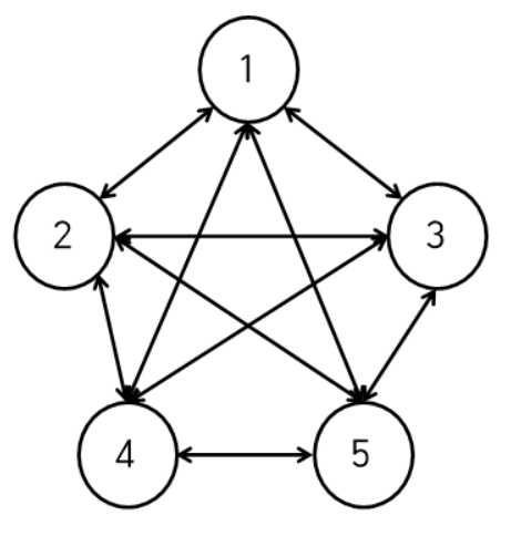 위 그림과 같이 1~5번 도시들과 이동 가능한 경로가 있다고 합시다.
