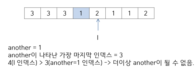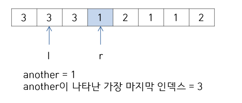 따라서 now는 다음에 탐색하고자 하는 범위에서도 유효한 값이므로 another값을 now(1)로 갱신해준다. another값이 다음에 탐색하고자 하는 범위에서 유효하지 않은 값이면 (마지막으로 나타난 인덱스가 l+1 보다 작은경우) another은 빈 값으로 갱신한다.