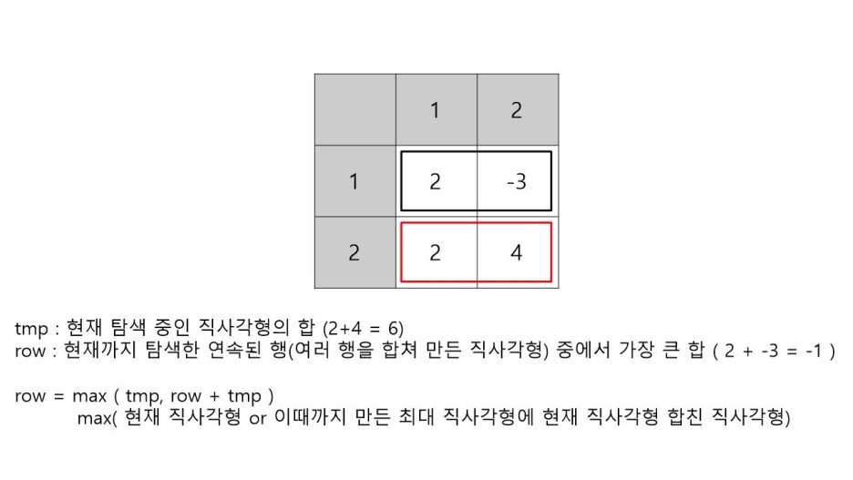 row는 현재까지 탐색한 열 범위([그림 2]에서 열 범위는 1~2)로 만들 수 있는 직사각형들 중 가장 큰 배열의 합을 의미한다.