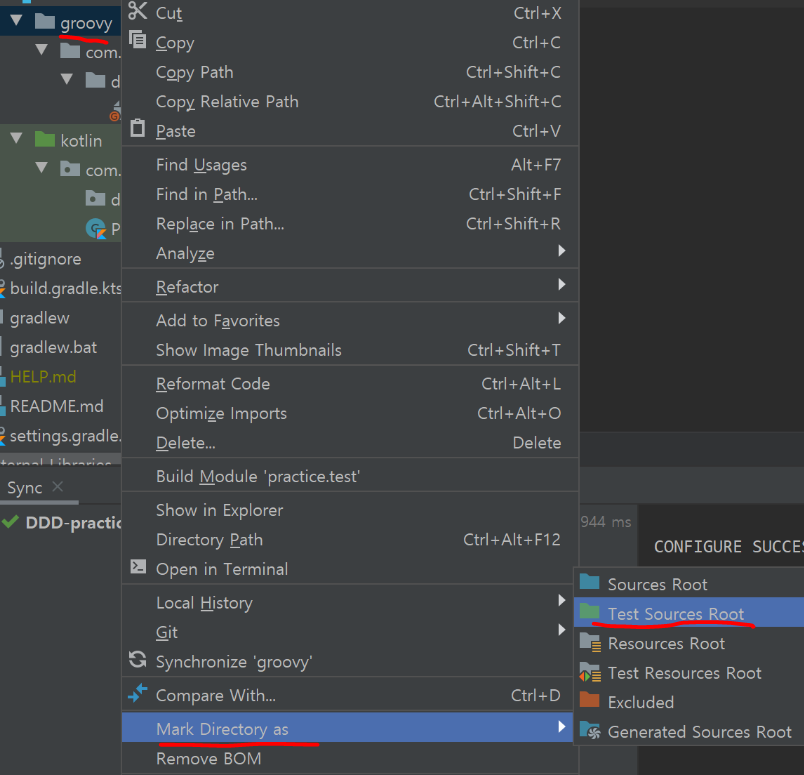 groovy 우클릭 > Mark Directory as > Test Sources Root 클릭