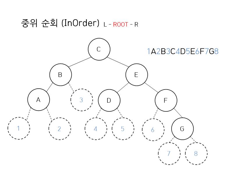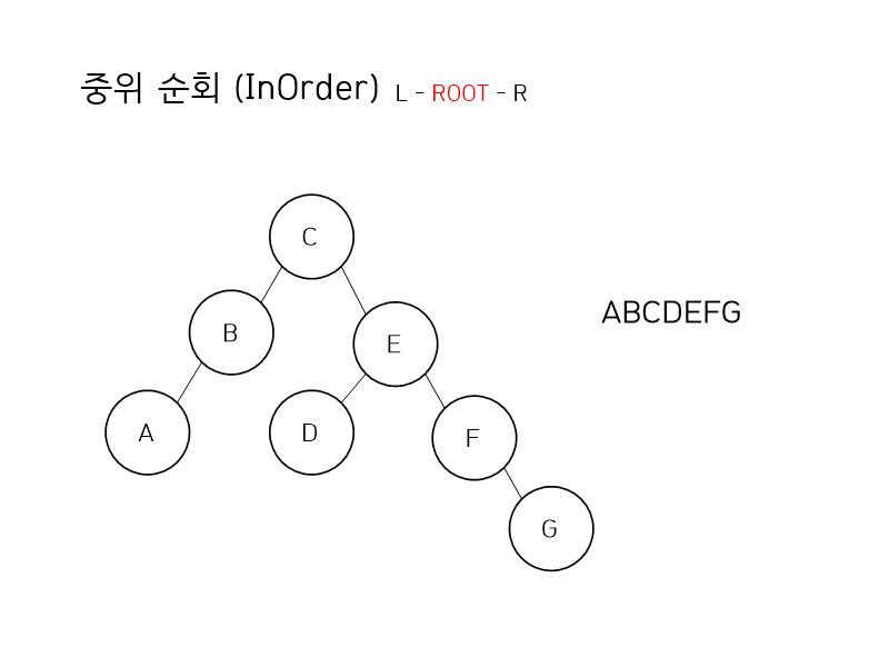 그 다음은 중위 순회 입니다. 왼쪽 - 루트 - 오른쪽 순으로 순회한다면 결과는 ABCDEFG 가 됩니다.