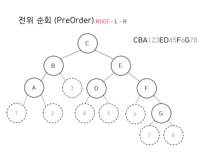 만약 잘 이해가 되지 않는다면 [그림 3]처럼 모든 노드에 왼쪽 자식과 오른쪽 자식을 임의로 그려놓고 탐색해봅시다. 그러면 결과가 CBA123ED45F6G78이 됩니다. 여기서 숫자들을 뺀다면 예시 그래프의 전위 순회 결과가 나오게 되겠죠?