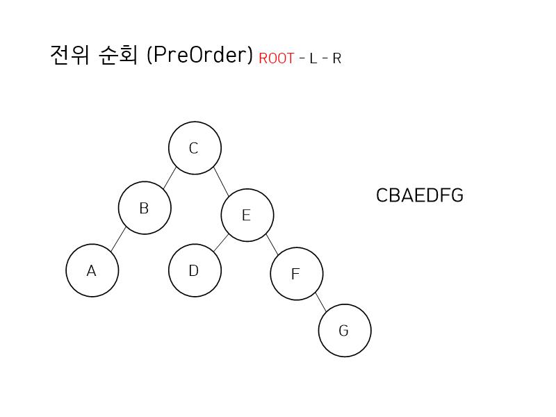 일단 전위 순회입니다. 루트 - 왼쪽 - 오른쪽 순으로 순회한다면 결과는 CBAEDFG 가 됩니다.