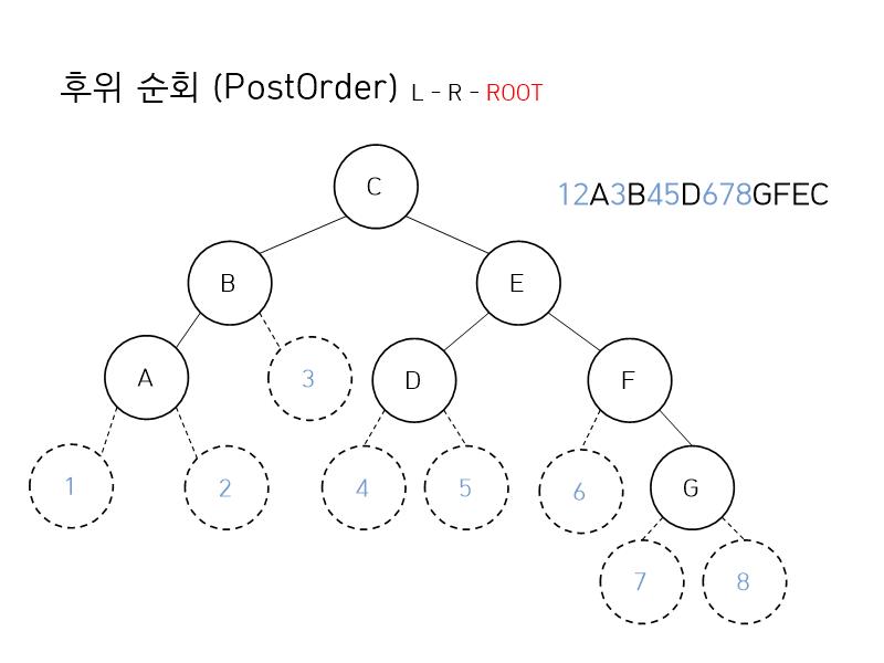 12A3B45D678GFEC 가 됩니다. 마찬가지로 여기서 숫자를 뺀다면 위에서 구한 후위 순회 결과가 나오게 됩니다.