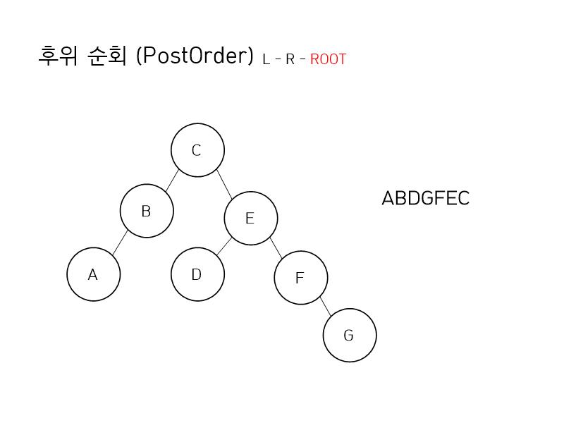 그 다음은 후위 순회 입니다. 왼쪽 - 오른쪽 - 루트 순으로 순회한다면 결과는 ABDGFEC 가 됩니다.