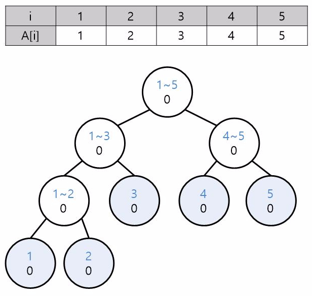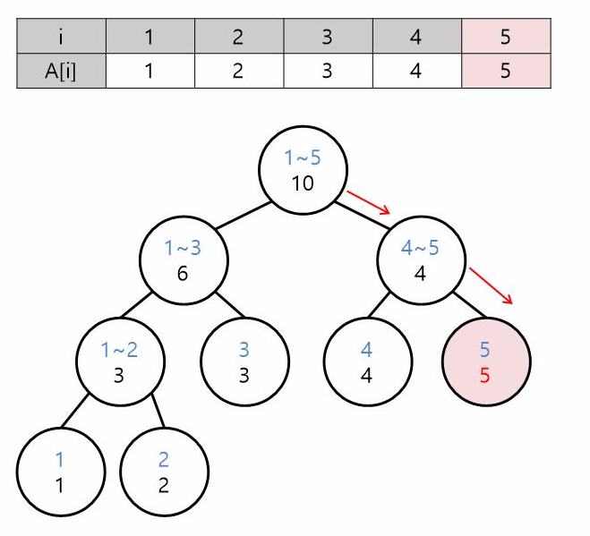 루트 노드에는 1~5(1~N) 구간의 값, 여기서는 합을 구하려고 하니까 1~5번째 값들의 합을 저장합니다.