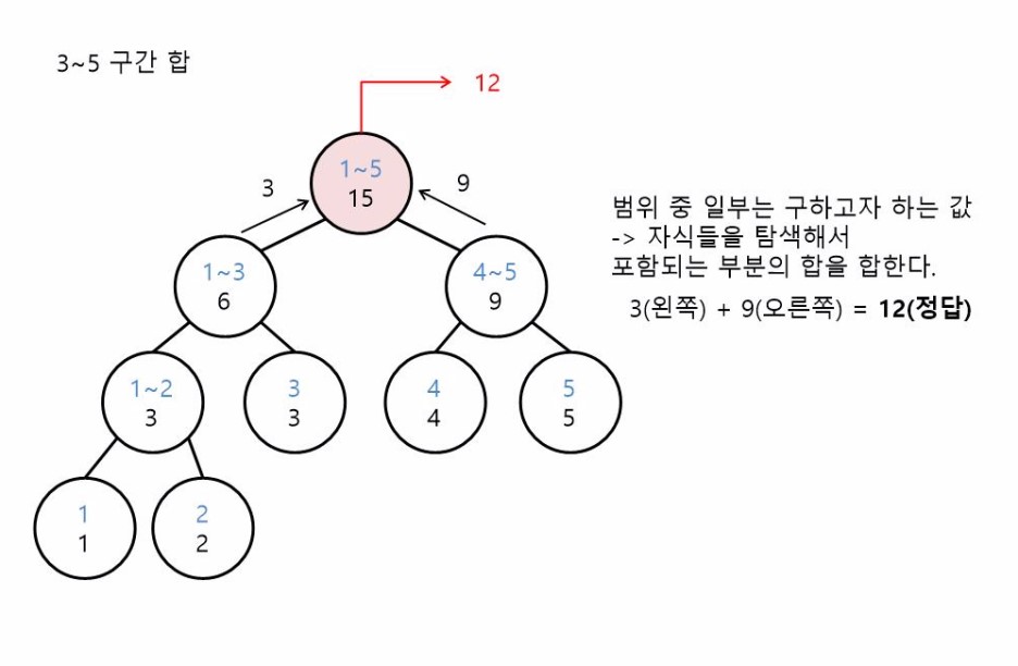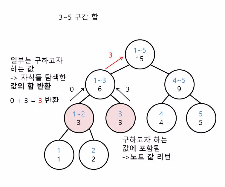 루트 노드가 가지고 있는 합의 구간은 1~5입니다. 그런데 저희는 지금 3~5를 구하고 싶습니다.
