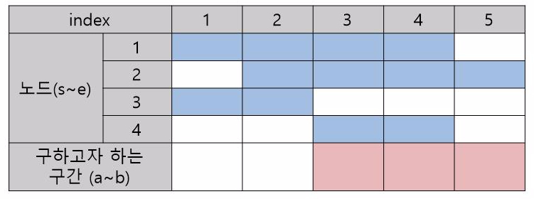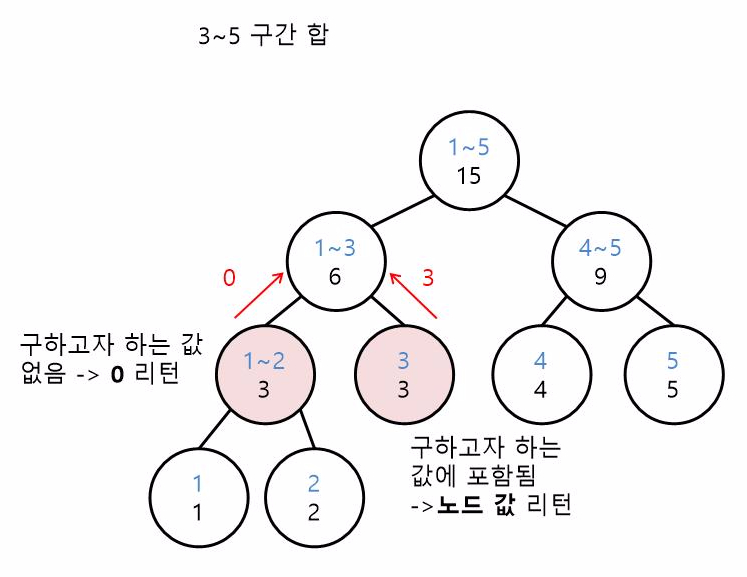 1~2의 구간 합은 저희가 구하고자 하는 값과 교집합이 하나도 없네요. 즉, 우리가 필요한 값이 하나도 없다는 뜻으로 0을 리턴해줍니다.[3]