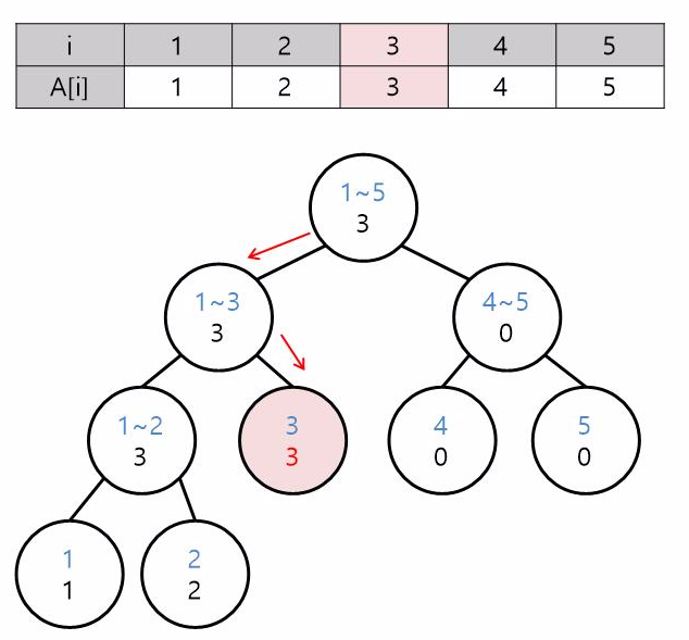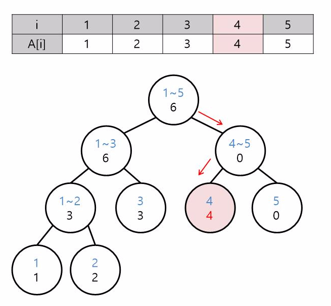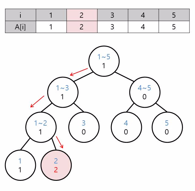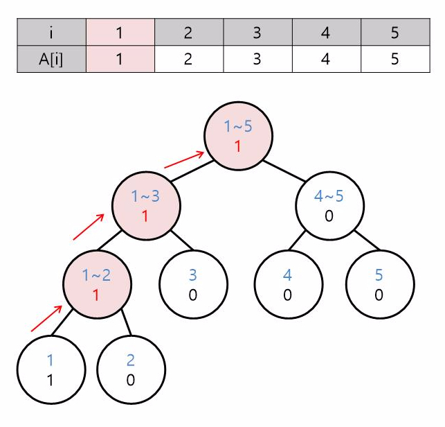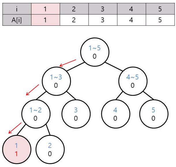 i가 1인 수를 넣으려면 노드의 인덱스와 i를 비교하여 단노드까지 내려갑니다. 여기서는 노드의 인덱스 범위가 1~1인 노드를 찾으면 되겠죠?