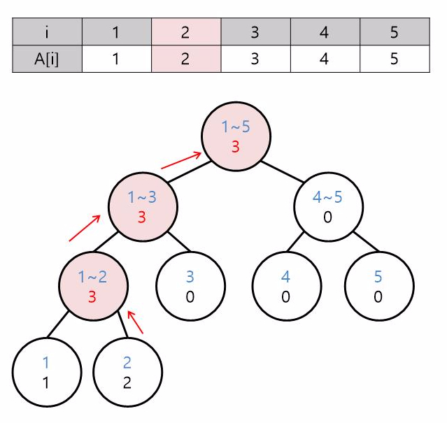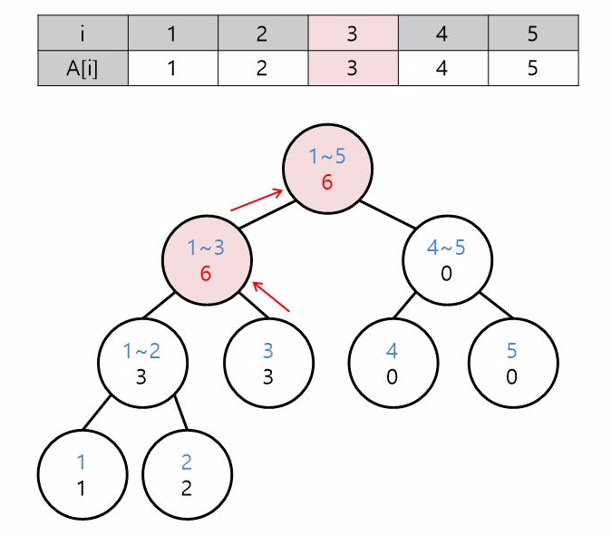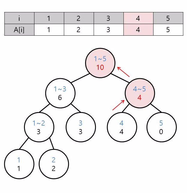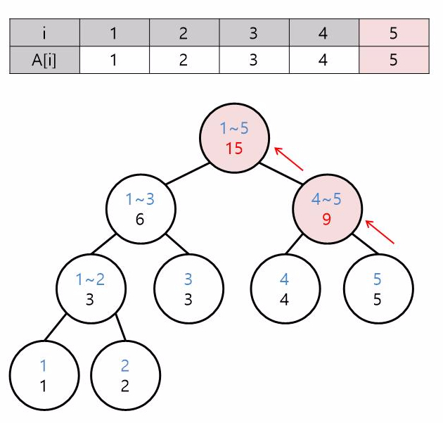 완성된 트리에서 수열 A의 값이 변경되어서 트리를 갱신해야 할 때도 위의 방법과 마찬가지로 진행하면 됩니다. 변경되야 할 인덱스에 해당되는 노드를 찾고 갱신한 뒤, 거슬러 올라가면서 해당 노드의 값들을 갱신합니다.