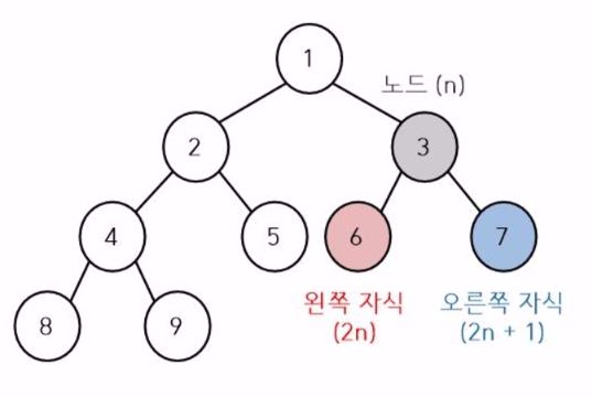 이진 트리의 값을 저장할 때 배열을 사용하면 노드 인덱스가n일 때, 왼쪽 자식은2n, 오른쪽 자식은 2n+1이 되므로 인덱스로 트리 노드 값에 접근이 쉽습니다.