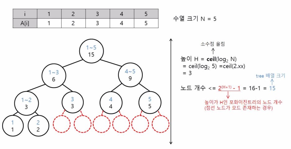 수열의 크기를 N이라고 했을 때, 세그먼트 트리의 높이 H는 log2N을 소수점 첫째 자리에서 올림해준 값과 같습니다. 포화 이진트리에서 노드 개수는 2(트리 높이+1)-1 입니다. 따라서 [그림 3]과 같은 경우 배열의 크기를 15로 만들어주면 세그먼트 트리를 모두 저장할 수 있습니다.