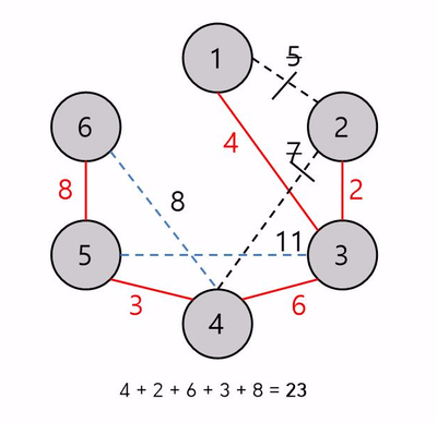 채택한 간선들의 합은 23이 되고 이가 곧 MST를 만드는 비용이 됩니다.