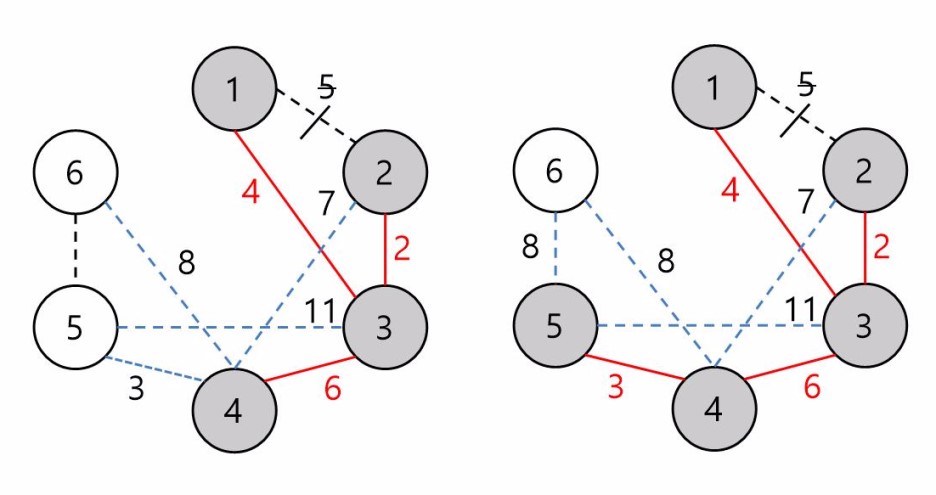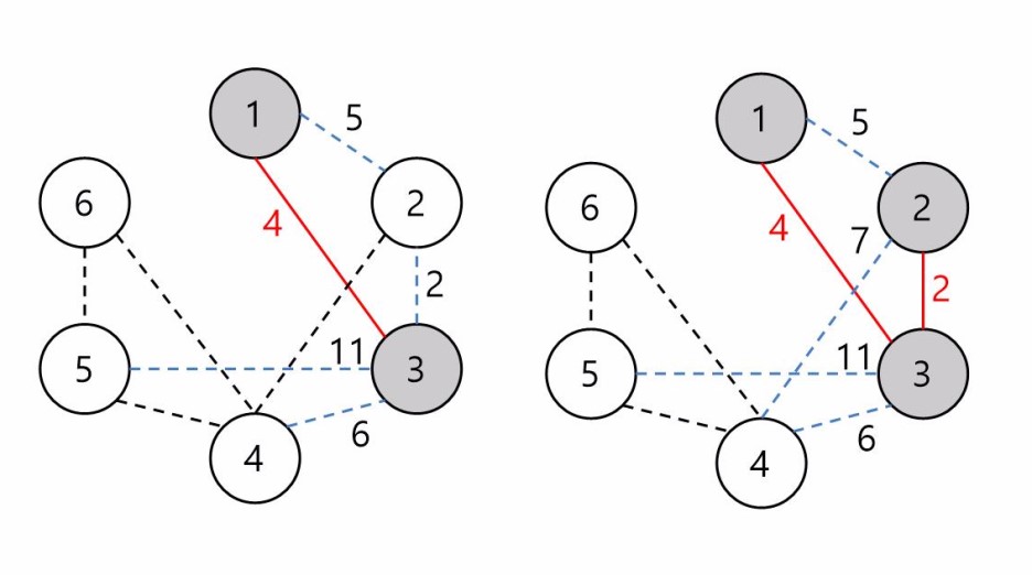 정점 4와 연결된 간선들도 포함하여 아직 선택되지 않은 정점과 연결된 최소값의 간선을 찾아보면 [그림3]의 오른쪽 그림과 같아집니다.(정점 5와 연결된 가중치 3인 간선 선택)