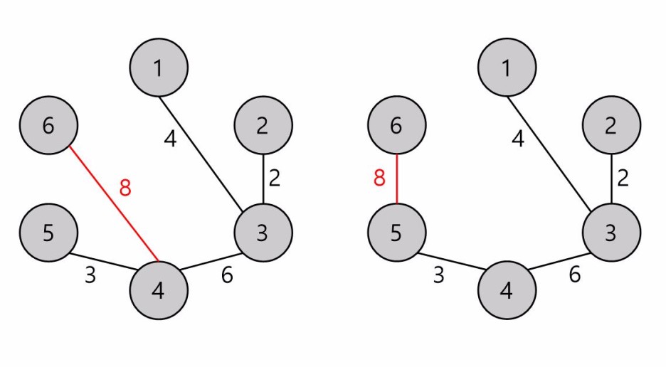 처음에 "간선들의 비용 합이 최소인 경우는 여러 개 나올 수 있으므로 하나 이상 존재한다"는 이야기를 했었는데 [그림 4]의 마지막 단계에서 보면 간선 가중치가 8인것은 2개가 있고 간선 2개다 아직 선택하지 않은 정점인 6과 연결되어 있어서 채택할 수 있습니다. 따라서 두 간선을 각 각 선택했을 때 나오는 그림은 [그림 5]와 같고 두 트리 모두 MST 조건을 만족한다는 것을 알 수 있습니다. 이와 같이 MST는 가중치의 값은 같을 수 있어도 모양은 여러 개 나올 수 있습니다.