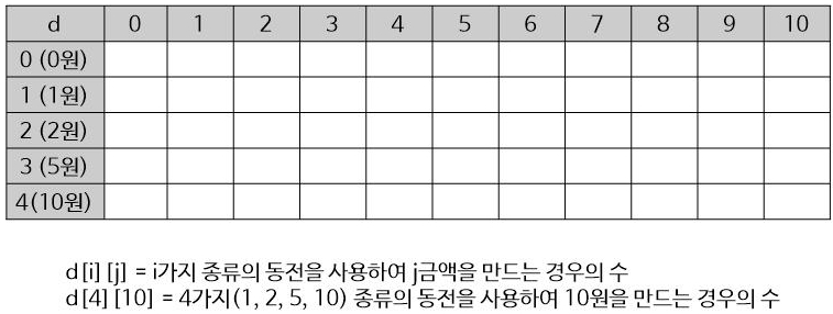 d[i][j] = i가지 종류의 동전을 사용해서 j금액을 만드는 모든 경우의 수