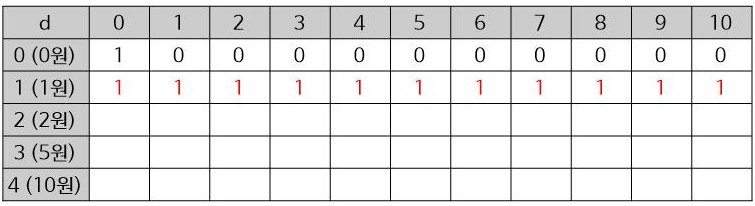 1원으로 j금액을 만드는 방법은 동전을 모든 금액이든 1가지 방법밖에 없으므로 1입니다.