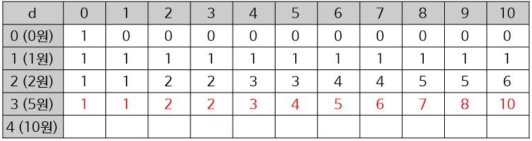 2행은 2가지 종류로 j금액을 만드는 경우의 수입니다.