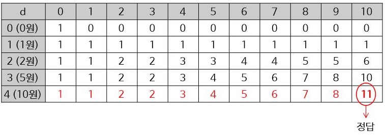 정답은 d[4][10] = 11이 됩니다.