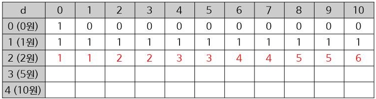 d[2][2]는 0원에 2원 1개를 추가하여 금액2를 만들 수 있고(d[2][0]) 아까 구한 1가지 종류로 금액2를 만드는 경우의 수(d[1][2])를 더한 수입니다.