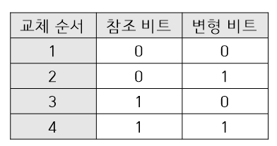 최근 사용 여부를 확인하기 위해 참조 비트와 변경 비트, 2개의 비트가 사용된다.