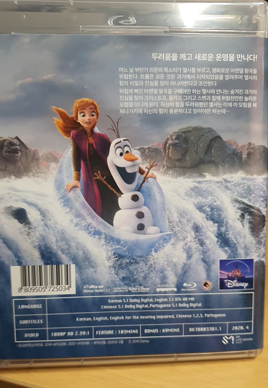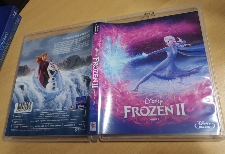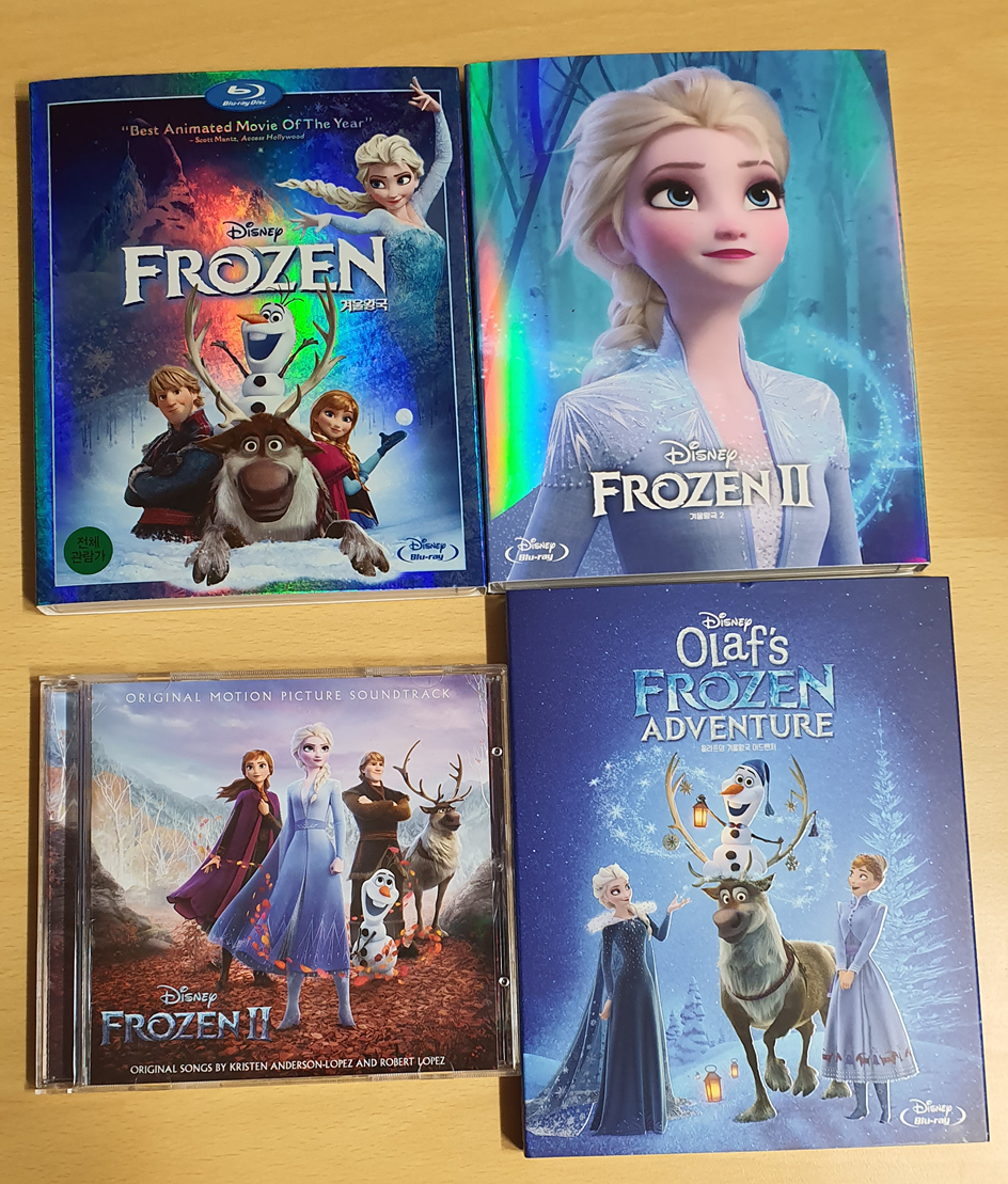 겨울왕국 1, 2 블루레이. 올라프 어드벤쳐(단편 모음이라 분량 되게 적다). OST CD.