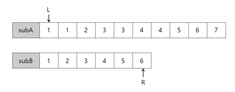 3. subA를 왼쪽(L)부터, subB를 오른쪽(R)부터 탐색합니다.
