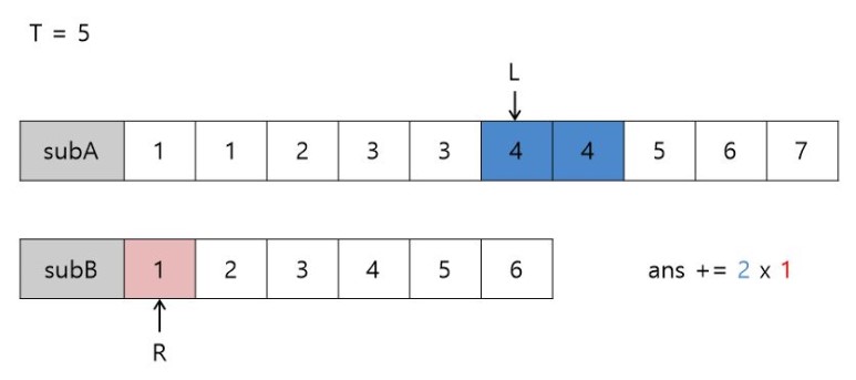 4+1 = 5 (==T) 이므로 subA에서 4의 개수(2) x subB에서 1의 개수(1)의 값을 정답에 더하고 L++, R-- 해줍니다. (L=6, 7 / R=1)
