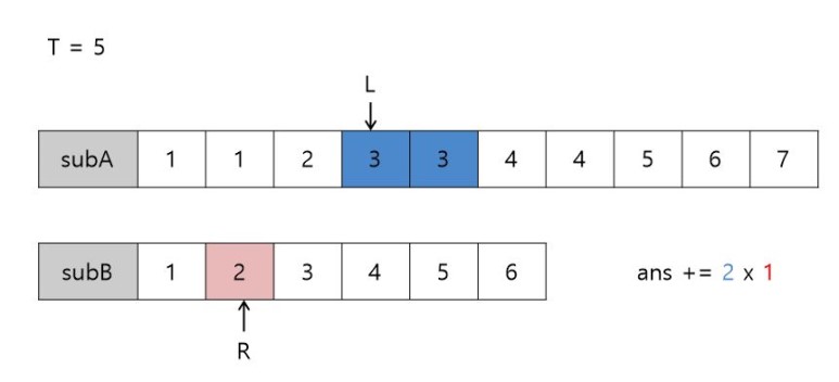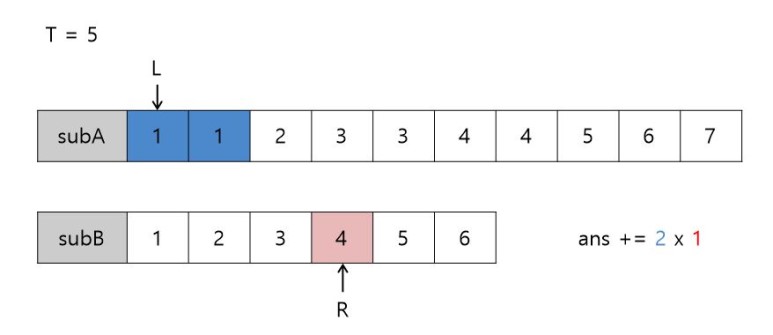 3+2 = 5 (==T) 이므로 subA에서 3의 개수(2) x subB에서 2의 개수(1)의 값을 정답에 더하고 L++, R-- 해줍니다. (L=4, 5 / R=2)
