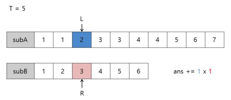 2+3 = 5 (==T) 이므로 subA에서 2의 개수(1) x subB에서 3의 개수(1)의 값을 정답에 더하고 L++, R-- 해줍니다. (L=3 / R=3)