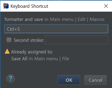기존에 저장되어 있는 단축키를 어떻게 할 거냐고 알림창이 뜹니다.