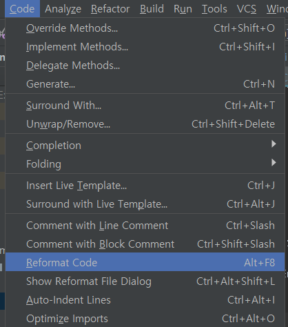 Code > Reformat Code ( Alt + F8 ) : 포매터 적용.