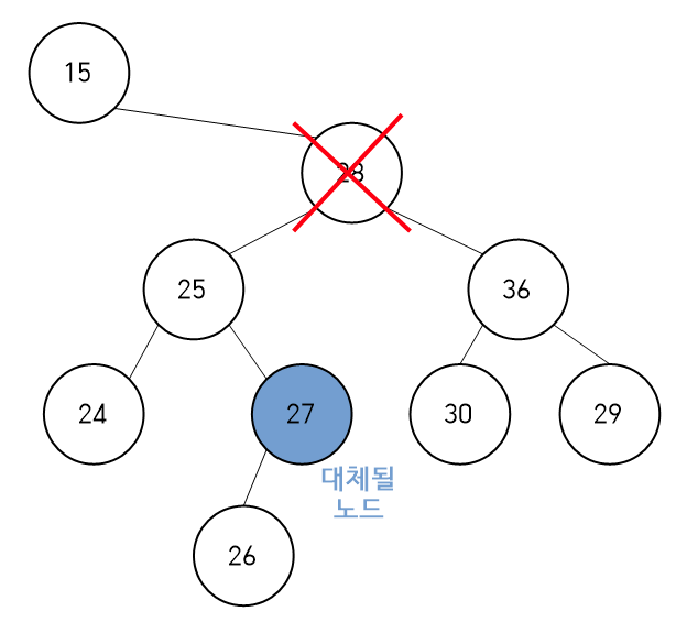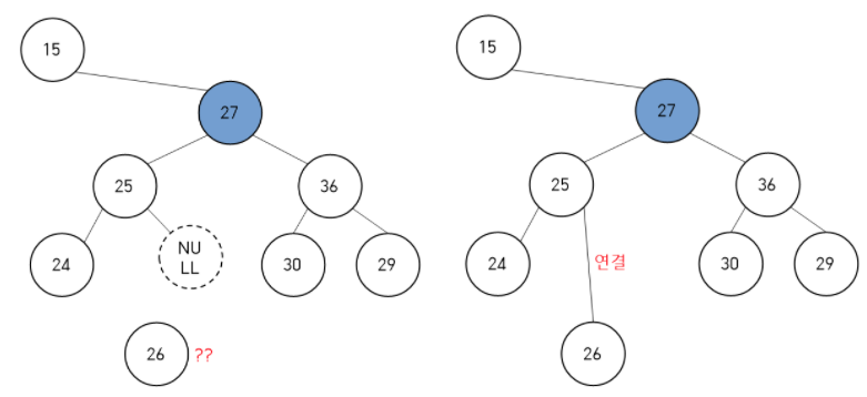 따라서 부모 노드(25)의 오른쪽 자식 노드를 대체되는 노드(27)의 왼쪽 자식 노드(26)에 연결 해주면된다.