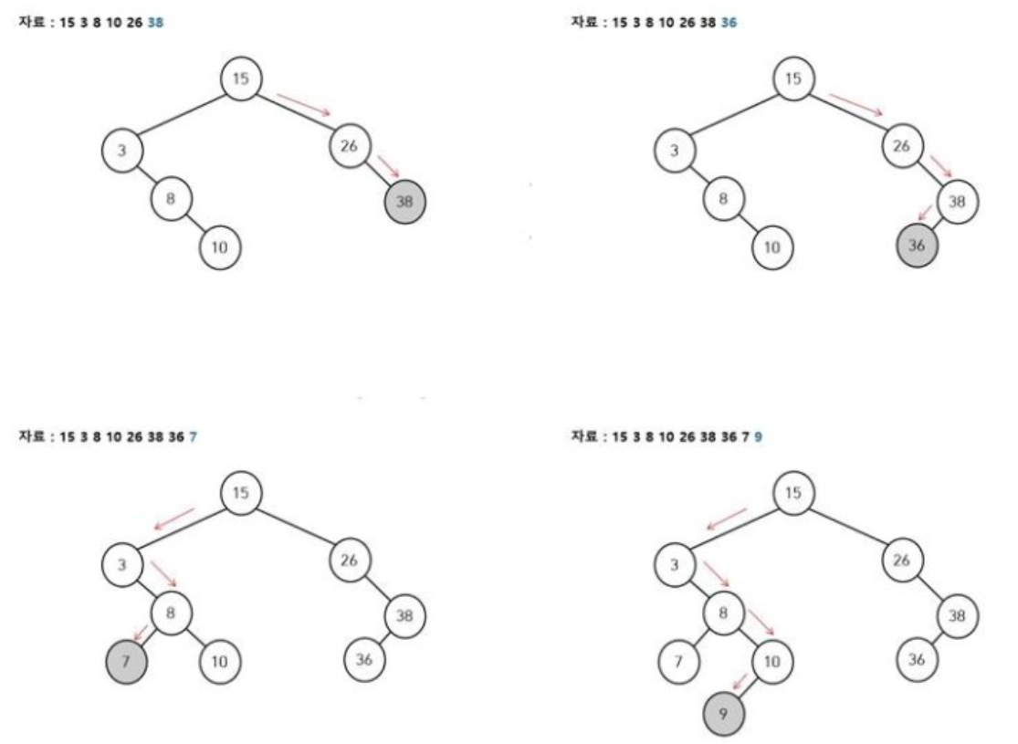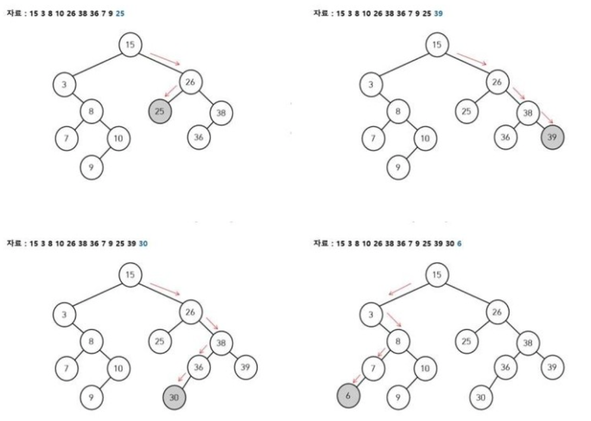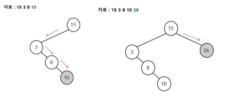 작으면 왼쪽, 크면 오른쪽 자식 노드로 내려갑니다.