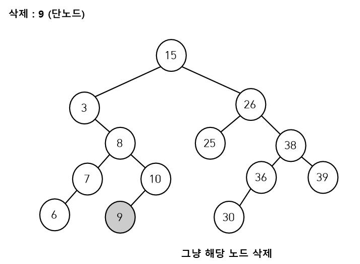예시에서는 자식이 1개 존재하므로(노드 9) 이를 노드 10이 있던 자리로 대체한 결과입니다.
