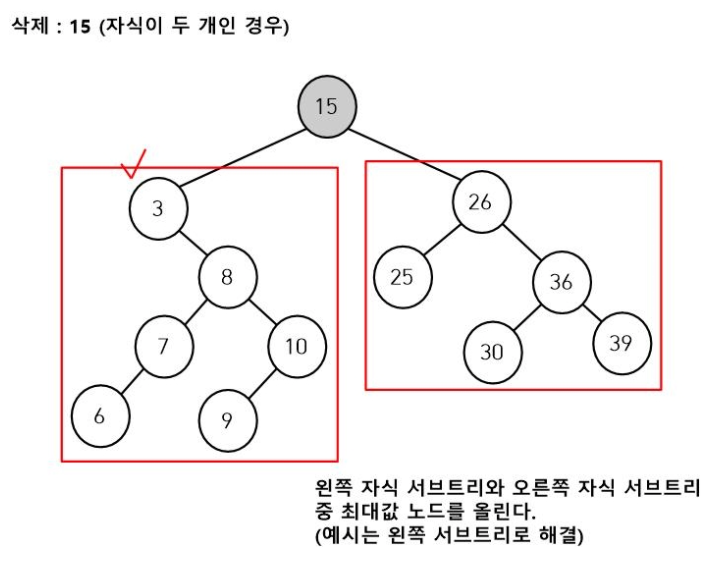 삭제한 노드 위치를 왼쪽 자식 서브트리 혹은 오른쪽 자식 서브트리의 최대값 노드를 올립니다.