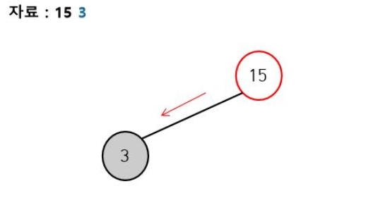 3은 15보다 작으므로 왼쪽 자식으로 내려가야 하는데, 15노드의 왼쪽 자식이 없으므로 노드를 생성해 연결해 줍니다.