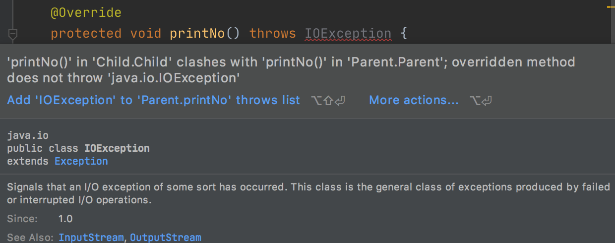 만약 ObjectStreamException 보다 더 넓은 범위의 예외(ex, IOException)을 던지고자 할 때는 위와 같은 에러를 뱉는다.