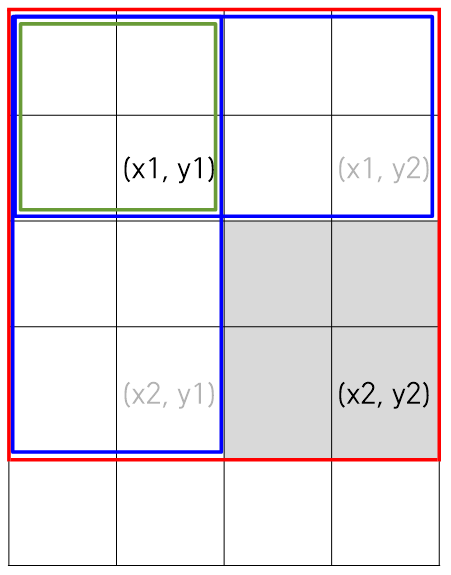 [그림 2]를 보면 우리가 알고싶은 범위는 회색이고. 이는 빨간색 사각형 - 파란색 사각형 + 중복으로 제거된 초록색 사각형 이다.