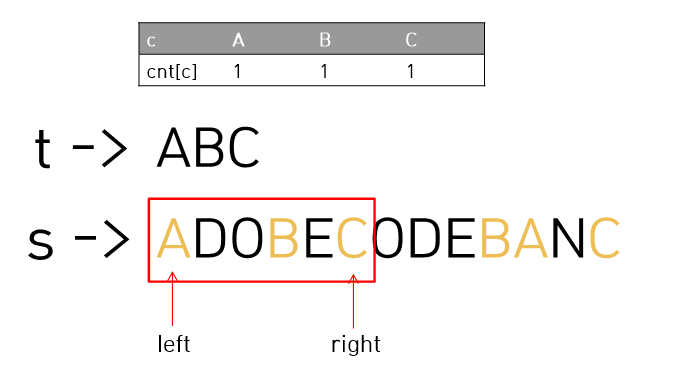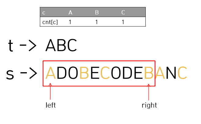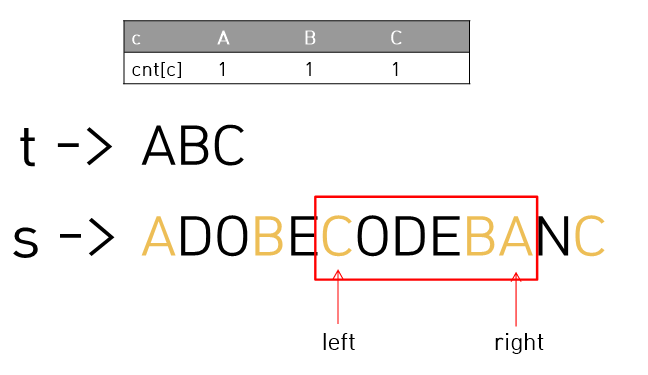 right 인덱스를 증가시키며 cnt 배열의 등장갯수를 모두 충족시킨다면 해당 right 인덱스를 부분문자열 끝으로 할 때, 해당 부분문자열을 최소 길이로 만들기 위해 left인덱스를 조정한다.
