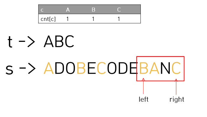 t 문자열의 갯수를 충족시킬때까지 right 인덱스를 증가시키면 인덱스 5(C)까지 탐색되고, 이 때, left 인덱스는 탐색중인 문자인 A를 제거한다면 t 문자열의 A 문자 갯수를 충족시키지 못하므로 0이된다.