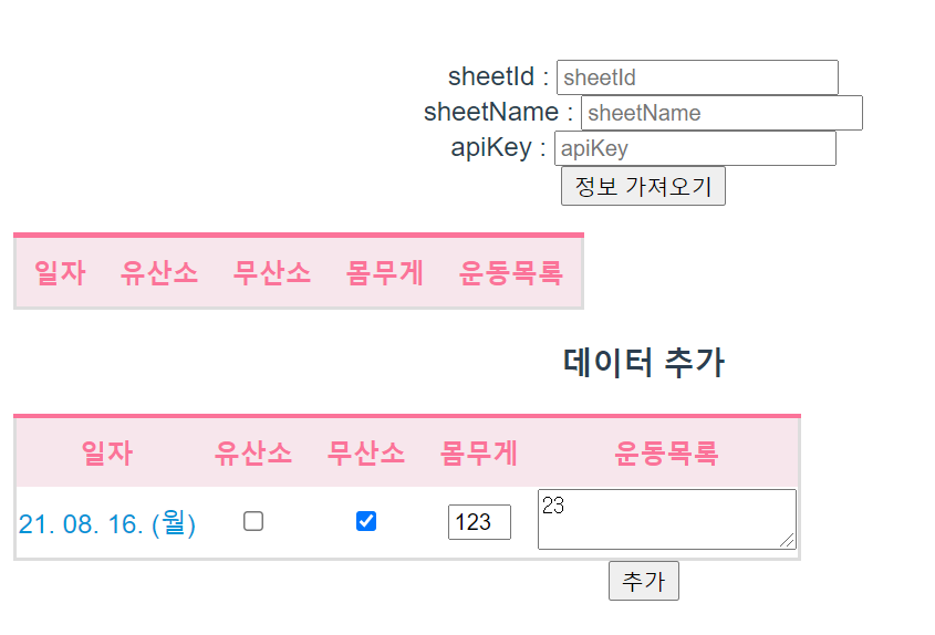 테이블은 기존과 동일한걸로 복붙해서 만들고 데이터 세팅하고 추가 버튼 누르면 구글 api로 요청이 간다.