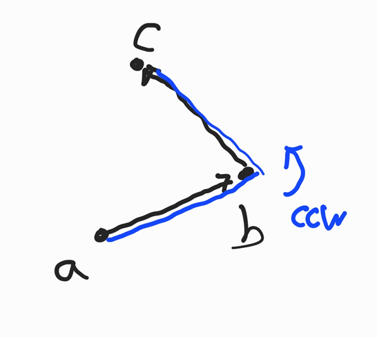만일 (a->b), (b->c) 벡터의 외적이 양수이거나 0인 경우 반시계방향이나 평행관계가 되어 b는 정답이 될 수 있다. 따라서 c를 정답배열에 추가하고 탐색을 이어나간다.