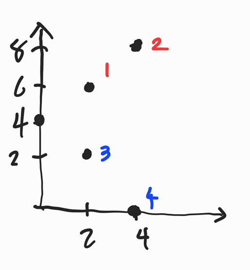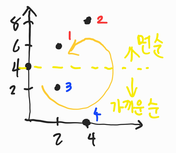 처음 중점이 되는 위치는 (0,4)(let, 0번)가 될 것이다. 각도별로 정렬하면 {3, 4, 1, 2} (번호로 적으면)가 된다.