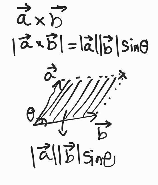 a, b 벡터의 크기는 위와 같은 수식으로 구할 수 있는데, 만일 두 벡터가 평행이라면 theta는 0이 되서 sin(0) = 0 이므로 외적의 크기는 0이된다.